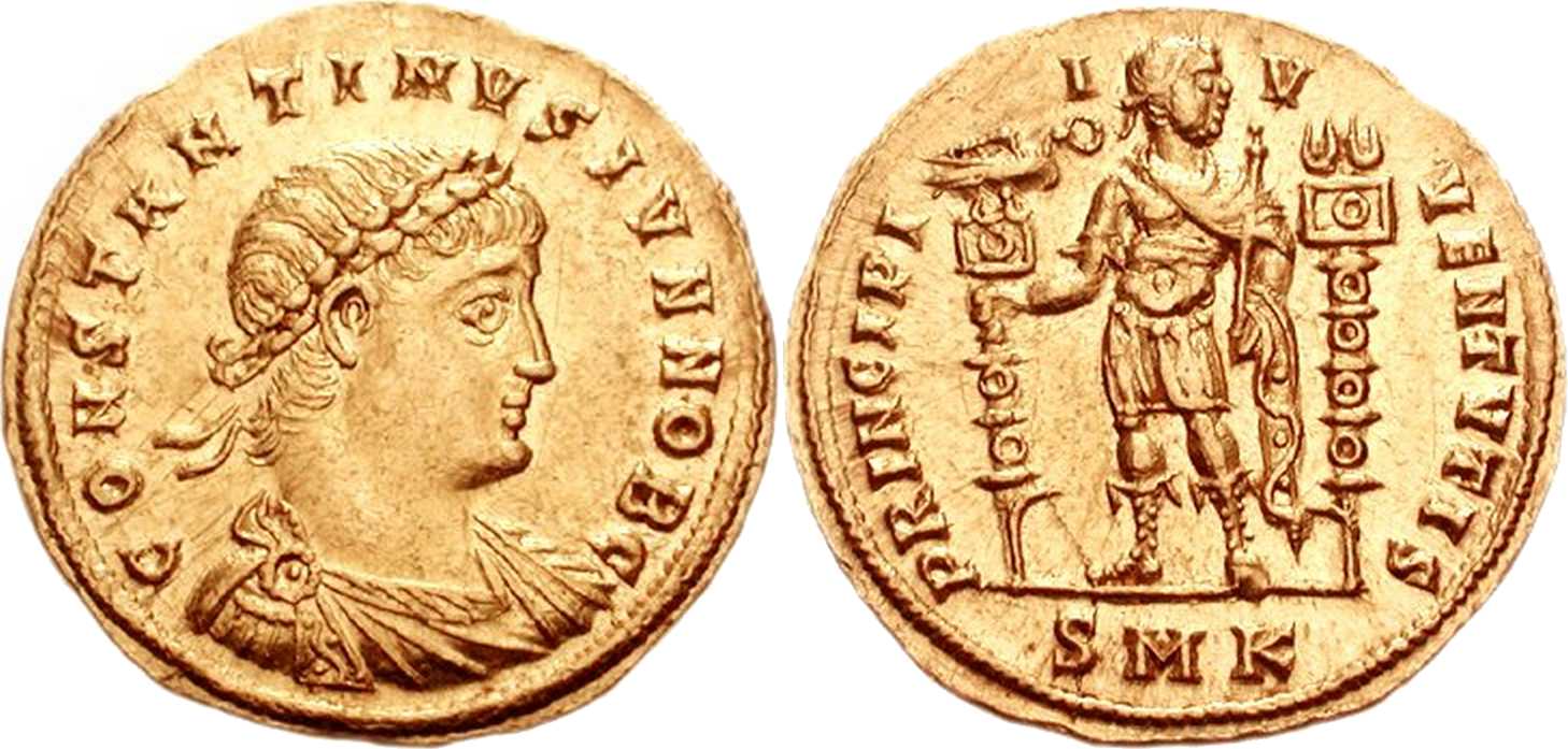 LONDON 119-123. Pattern with cross under S in left field does not exist and cross should be replaced with star. It is not a misprint because pattern with cross is also mentioned on p. 93. Kent lists only pattern with star (see: Kent, p. 37). Also in Bourton-on-the-Water Hoard 14 coins with S/*|P pattern were found and none with S/+|P (see: Bourton Hoard, p. 108 [no. 1313-1323] and p. 111 [no. 1451-1453]). See examples of LONDON 120 and LONDON 122 (from Beast Coins). But note that sometimes star of four rays could resemble a cross. See unlisted LONDON [after 119] (from Lee Toone's collection) and LONDON 123 (from Wildwinds; contributed by George Clegg).